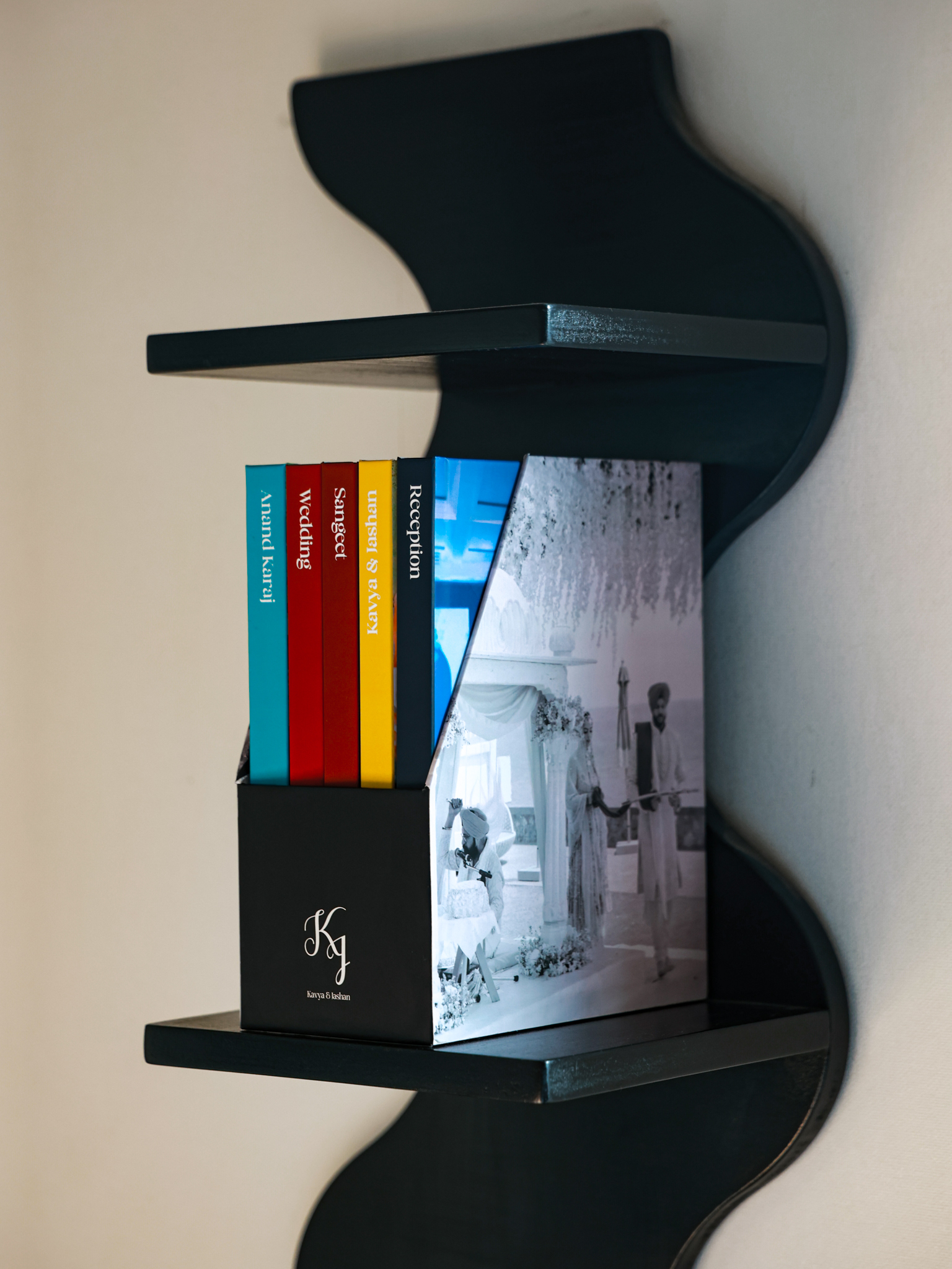 Housed in a custom-designed wedding box, the set is tailored precisely to the number of books and crafted to sit elegantly on a bookshelf. Each spine is individually marked with the event name and the couple’s initials, while the box itself is designed using imagery and visual elements selected by the family—making it as personal as it is luxurious.